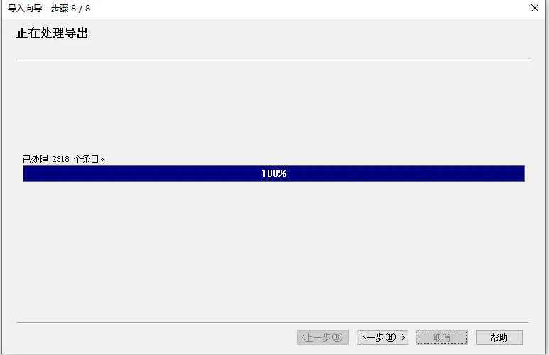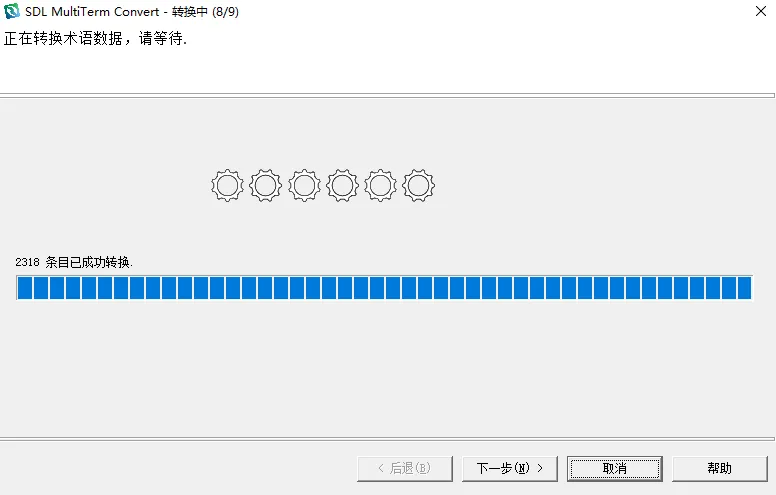 接着,将 excel 文档转换成 Trados 可识别的 xml 格式的 mtf 文件。利用SDL MultiTerm Convert 完成此步骤,转换术语数据时如下图所示,总共成功完成 2318 条目转换。