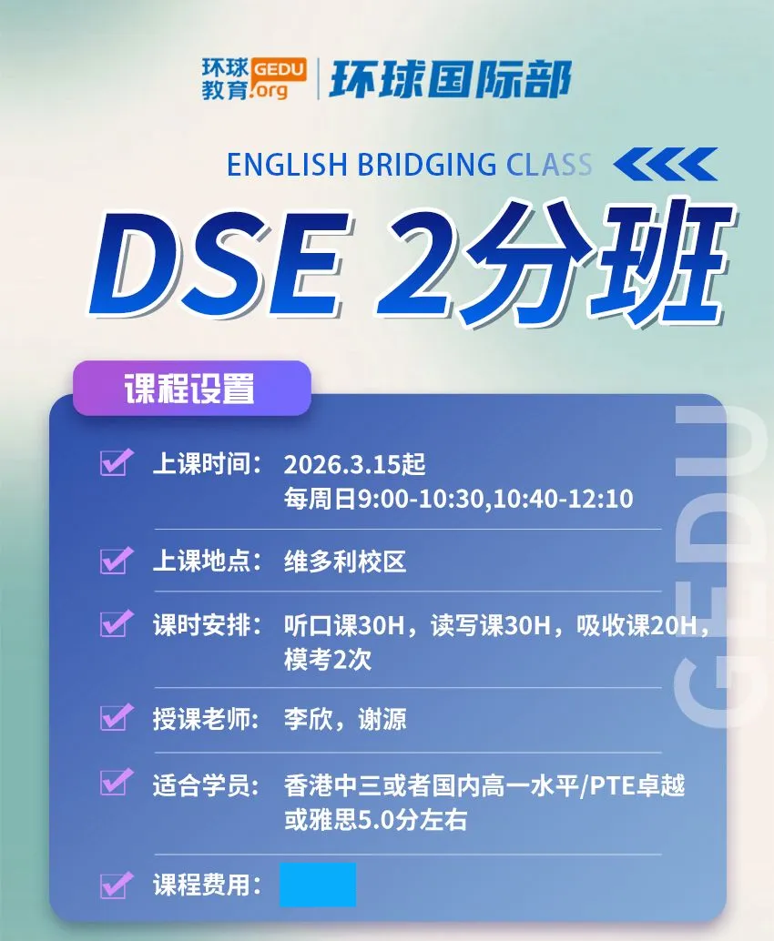 环球教育采用原版教材授课和原版练习册,综合独家教研题库,以两文三语深入教授原汁原味的正宗DSE课程,让学生无缝衔接语言。