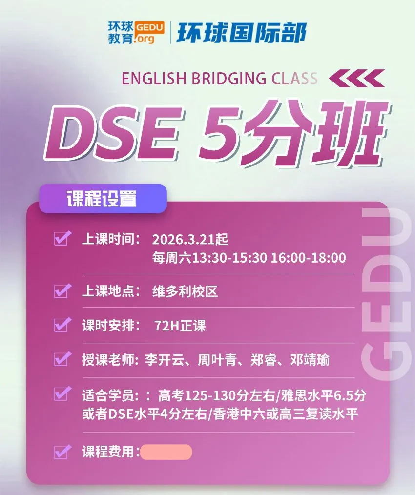 广州环球教育专业的DSE教师和辅导团队熟悉DSE考试的报名流程、要求和注意事项,可以为学员提供准确的报名指导,最大限度帮助学生和家长省心省力。