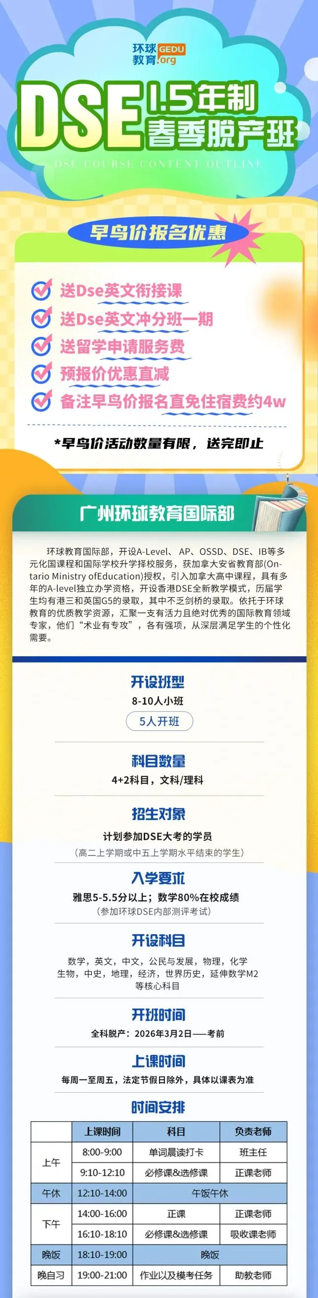 广州环球教育DSE采用主课老师 + 吸收课老师双师模式授课,并配备辅导员、留学老师、规划师为学生提供一站式的备考升学服务。