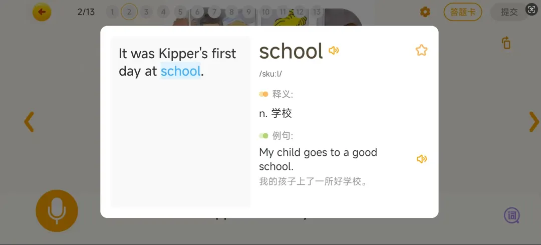 操作超简单:要么点击阅读页右下角“词”字图标,要么长按原文单词,就能快速看到单词的发音、释义和例句,不打断阅读节奏。更贴心的是,单词右上角设有小星星,点击即可点亮,系统会自动将该单词归入单词本,方便孩子定期复习,巩固记忆,学词效率事半功倍。