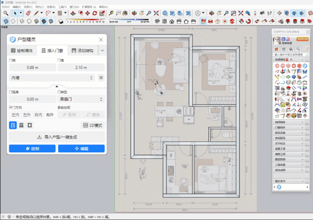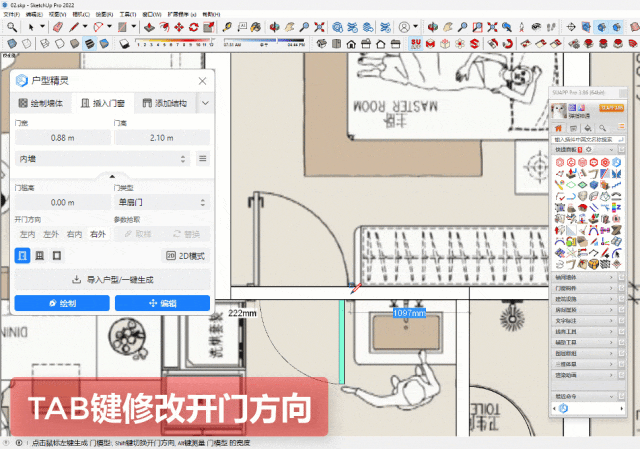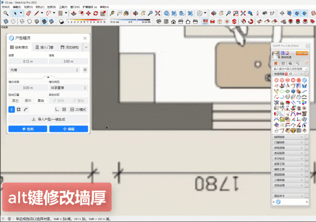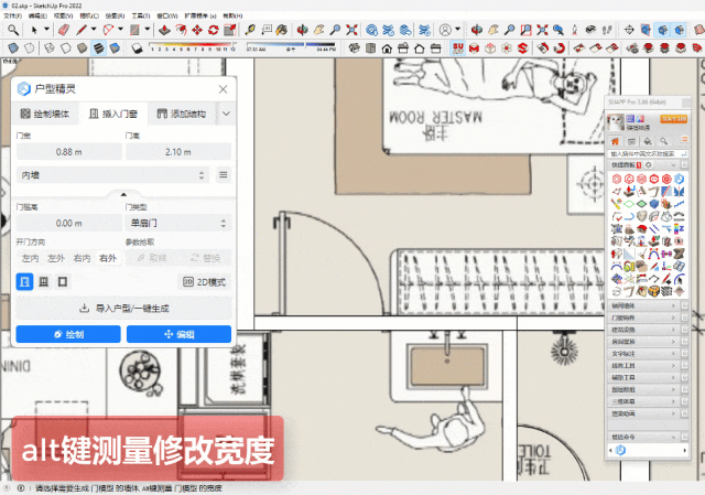 2.绘制过程中可以按shift修改开门方向,按住alt测量设置厚度
