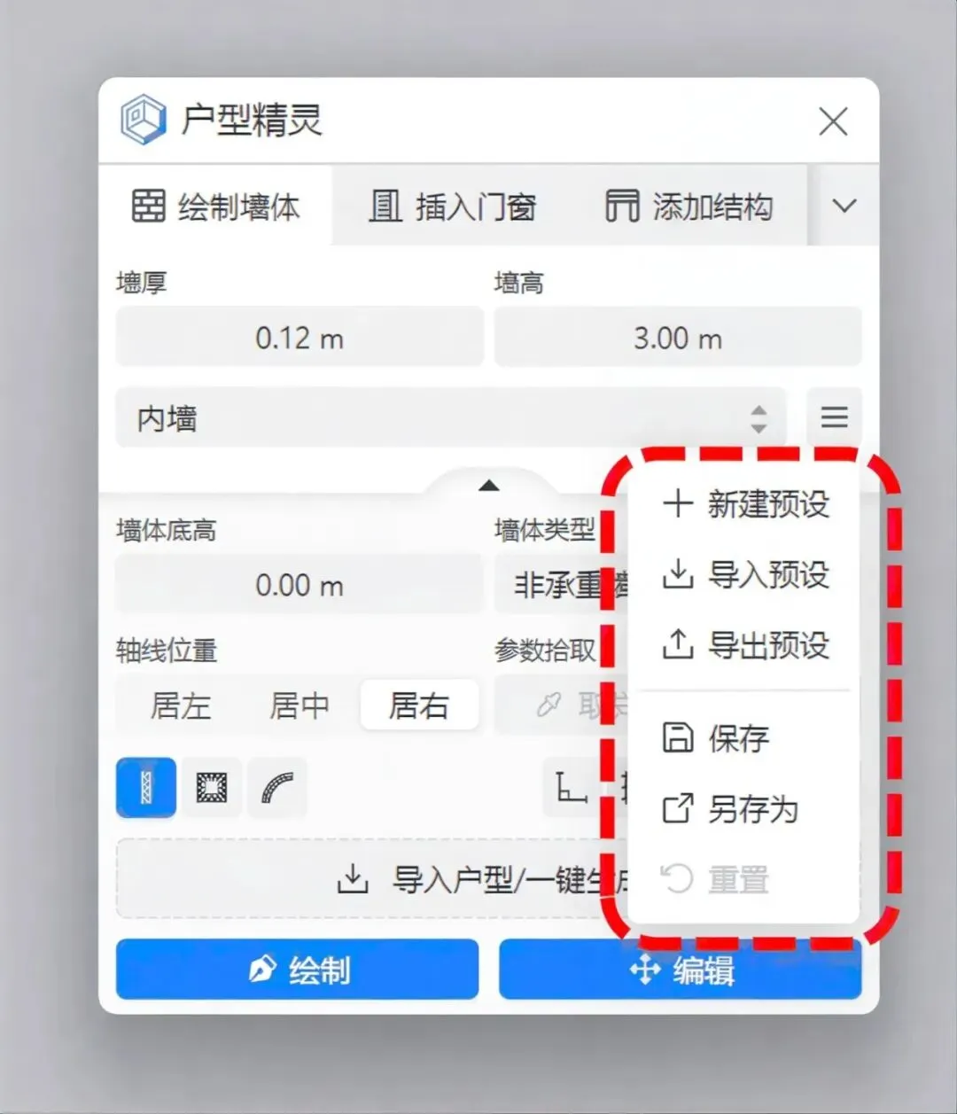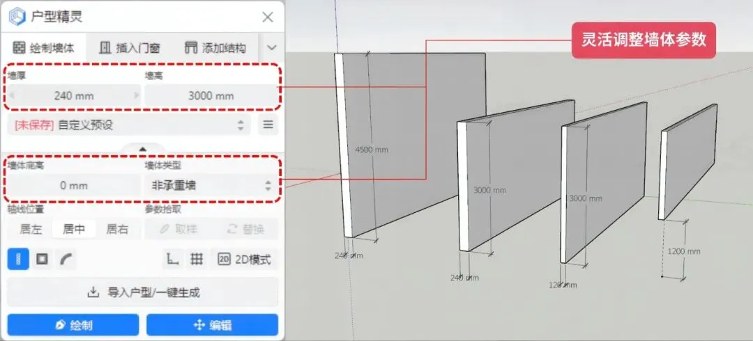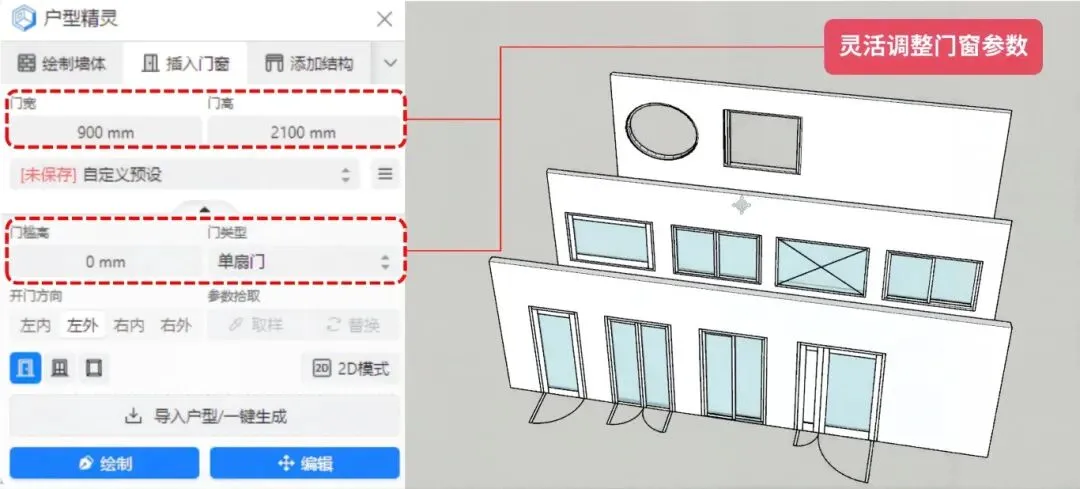 1.墙面插窗/插门/插洞;可以根据面板可以调整门窗的高宽、底部高度、类型等。