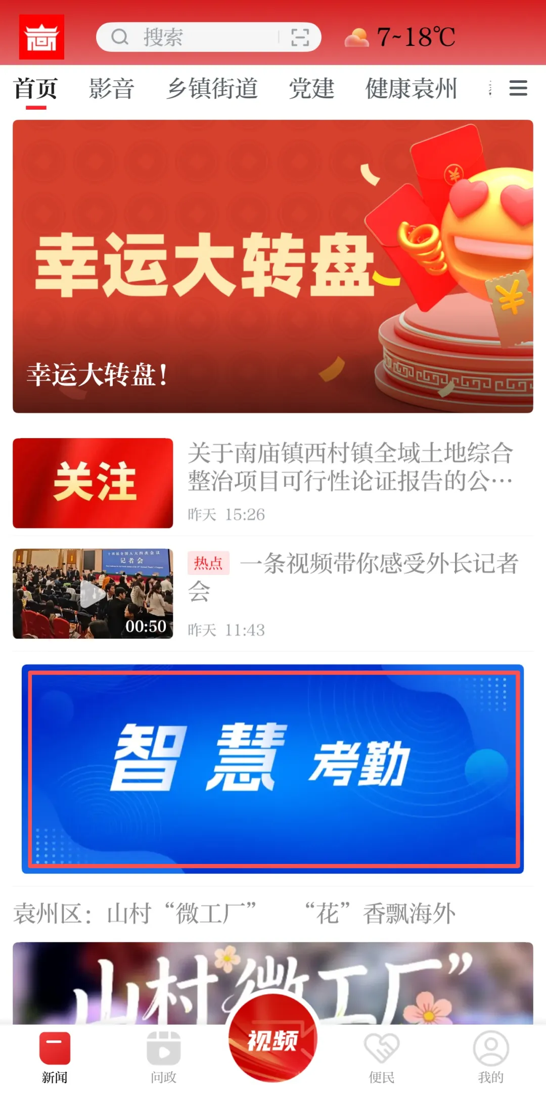 2.进入“袁州发布”APP首页,找到“智慧考勤”