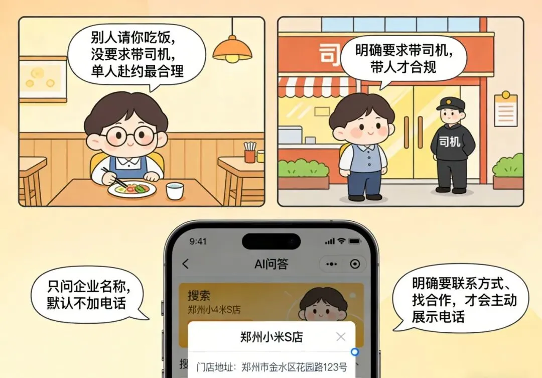 先打个通俗比方:别人请你吃饭,没要求带司机,单人赴约最合理;明确要求带司机,这时你带人去才合规。AI 问答也是同理 ——只问企业名称,默认不加电话;明确要联系方式、找合作,才会主动展示电话。