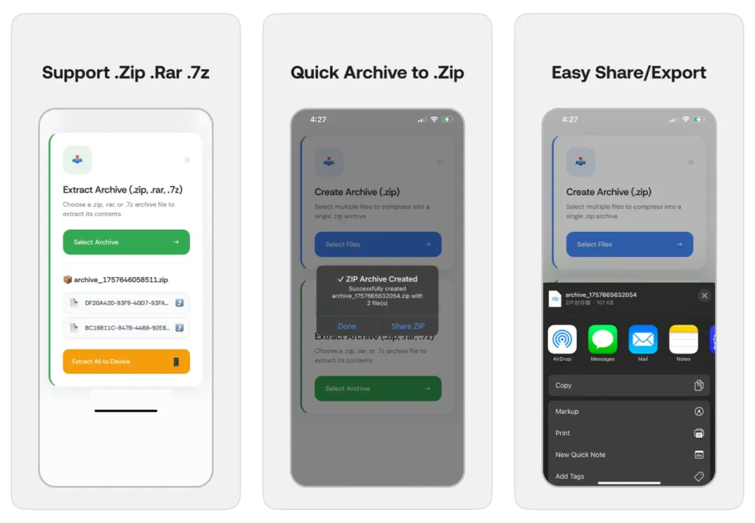一款轻量化效率类解压缩工具,支持ZIP、RAR、7Z 等多种主流压缩格式设备需装有 iOS 16.0 或更高版本。