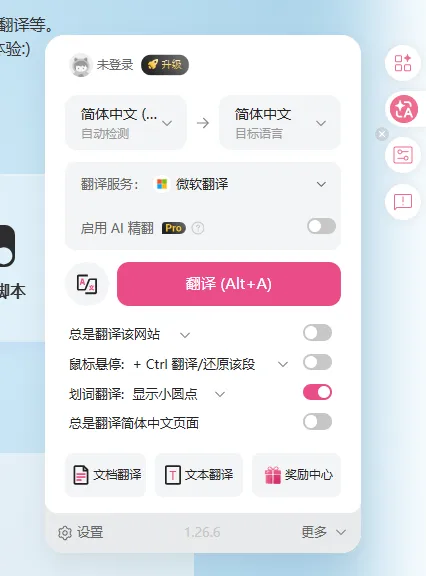 安装完成后,刷新网页,就能在页面侧边栏看到一个翻译悬浮球,可以在这里快速开启、调整翻译模式。