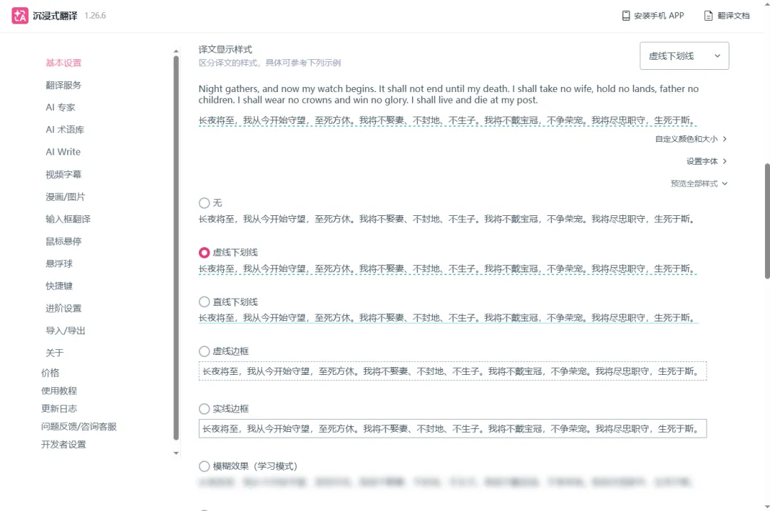而且支持多种译文显示样式,可以在设置 – 基本设置中自由选择。