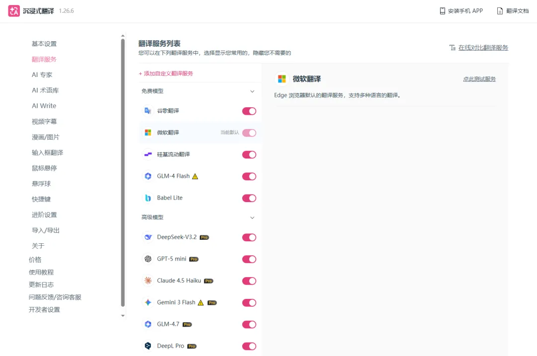 插件不仅对接了几十种翻译引擎和大模型,微软翻译、谷歌翻译、DeepL、Deepseek、OpenAI、Claude 等。