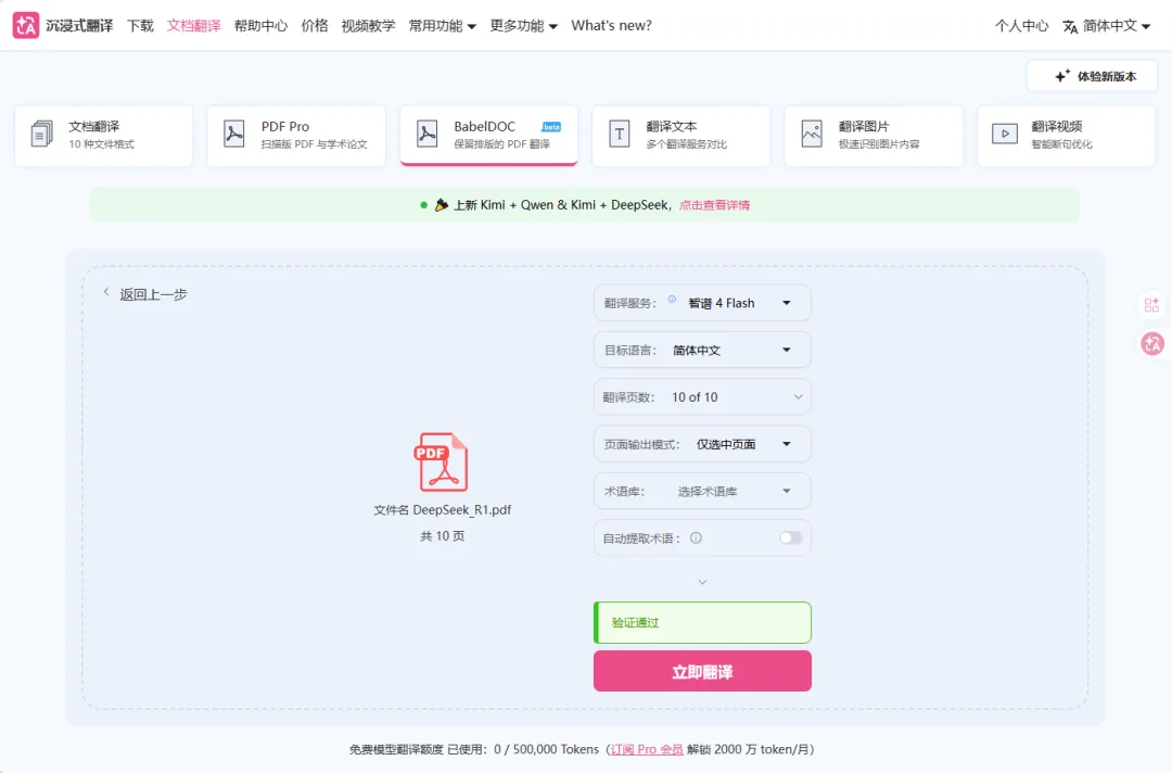 我用它翻译 DeepSeek_R1 的英文文档测试,打开 BabelDoc 页面后,上传文件,选择要使用的翻译服务、目标语言、术语库等,然后点击立即翻译。