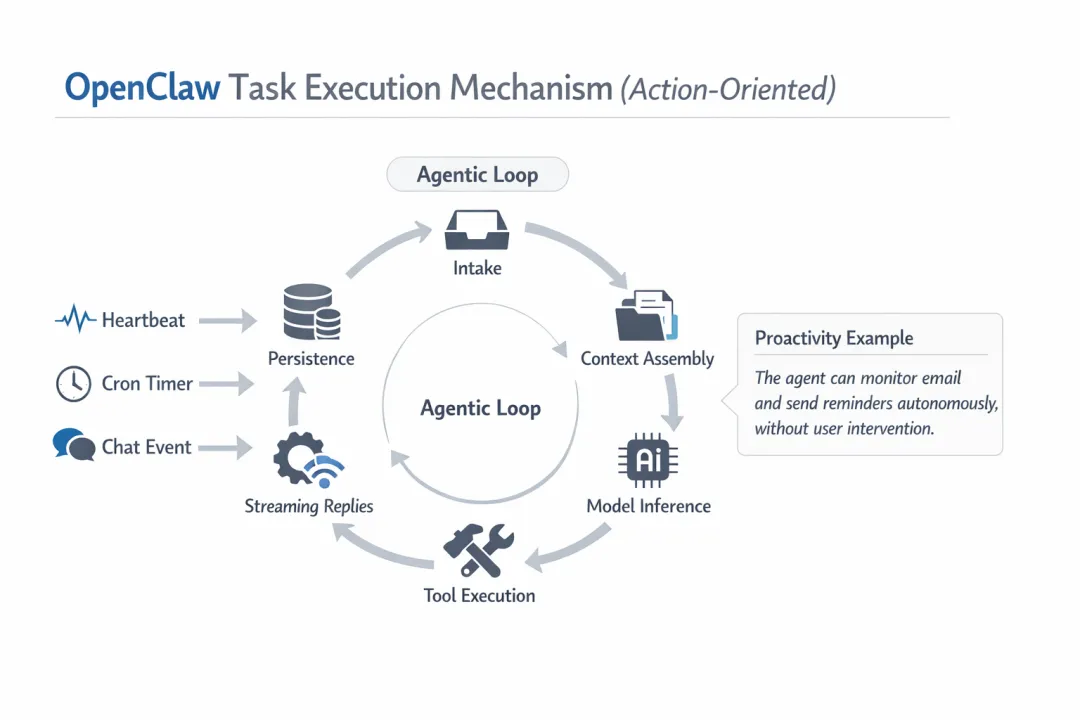 OpenClaw的任务执行机制采用“行动导向”设计,将智能体定位为一个持续运行的自主任务系统,而非单纯的聊天工具。该机制的核心是智能体循环(agentic loop):持续进行提取(intake)、上下文解析(context assembly)、模型推理(model inference)、工具执行(tool execution)、流式回复(streaming replies)和持久化(persistence)。这一循环通过事件触发(如心跳heartbeat、cron定时器、聊天事件)实现主动性。典型的例子就是智能体自主查看邮箱并发送提醒,而无需用户干预。换而言之,OpenClaw开启了007数字牛马(指自主任务大模型)的新篇章。