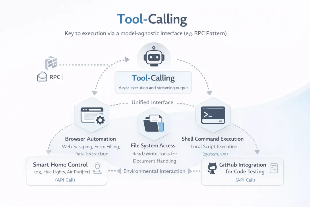 在OpenClaw中,工具调用(tool-calling)是执行的关键,即通过模型无关的接口(如RPC模式)调用内置工具,例如浏览器自动化(基于Chrome DevTools Protocol, CDP,实现网页抓取、表单填充和数据提取)、文件系统访问(read/write工具,用于文档处理)和shell脚本命令执行(system.run,用于运行本地脚本)。除了软件调用,OpenClaw的环境交互也可扩展到现实世界,如控制智能家居设备(如智能灯、空气净化器等)或动作控制(如设定机器狗的行进路径)。这些工具调用支持异步执行和流式处理,以确保OpenClaw与外界的高效交互。