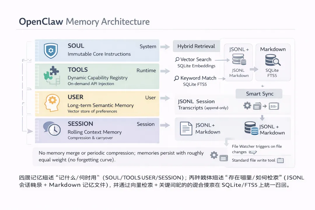 需要注意的是,OpenClaw 的记忆机制中没有记忆合并或月度/周度的记忆压缩。在这种简洁的存储机制下,智能体的记忆会永久保存,新记忆与旧记忆的权重基本相等。可以说,OpenClaw是不存在“遗忘曲线”的,当然这种方式也增加了存储系统的负担。