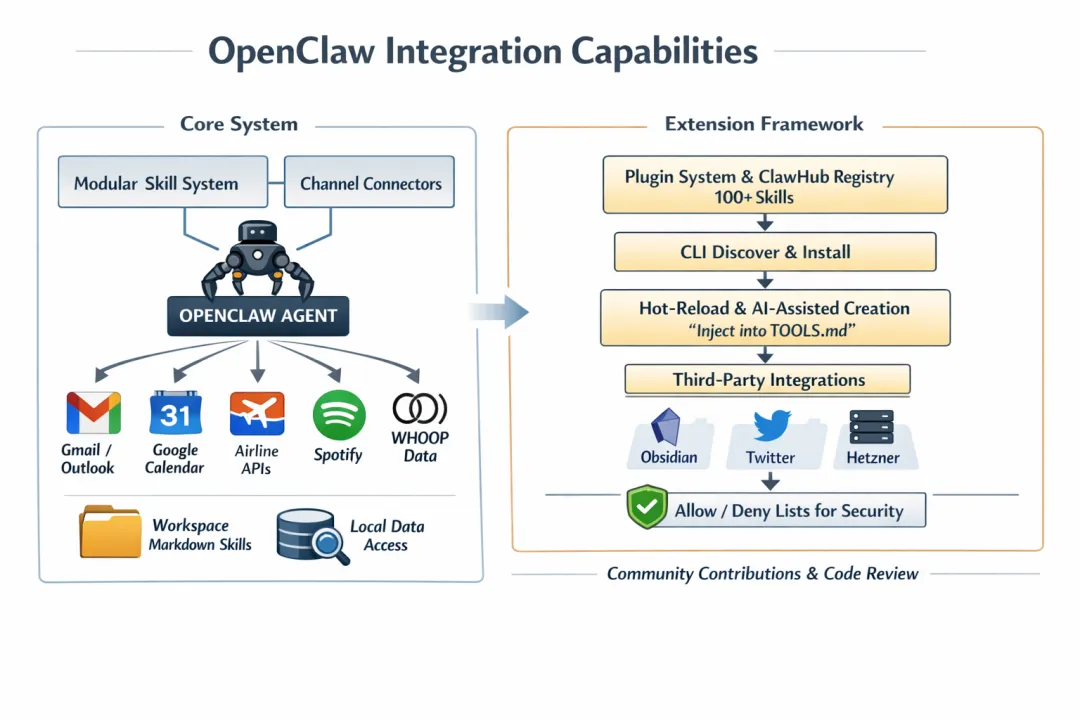 扩展框架基于插件系统和技能注册表(ClawHub),包含超过100个预构建技能,用户可通过CLI命令查找和安装,也可自定义新技能。生态集成强调可热重载(hot-reload)和AI辅助创建:智能体可从聊天或视频中生成自定义的技能(如短视频网站的视频处理),并注入到TOOLS.md文件中。扩展框架支持第三方集成,如Obsidian笔记和Hetzner服务器管理,通过允许/拒绝列表(allow/deny lists)控制访问权限,保障安全性。