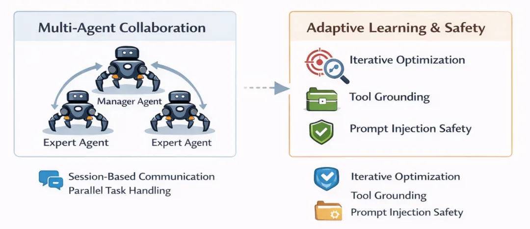 多智能体系统(multi-agent systems)通过sessions工具实现智能体间通信,支持智能体层次化(主管智能体和委托专家智能体)和并行任务(例如一个智能体监控邮箱,另一个处理日历)。这一设计允许实例复制或跨会话内存迁移,实现复杂工作流,如跨设备协调。