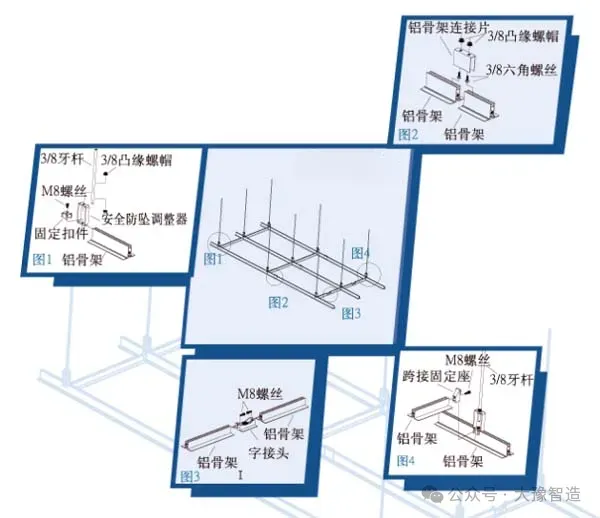 一、核对基准线 → 核对基准标高线 → 吊杆预制 → 放样吊杆安装 → 吊杆安装 → 吊顶龙骨预制→ 吊顶龙骨安装 → 吊顶龙骨水平调整 → 吊顶龙骨定位 → 十字补强片安装 → 测量畸零龙骨尺寸→界面收边 → 吊顶龙骨压盖安装 → 吊顶龙骨水平调整