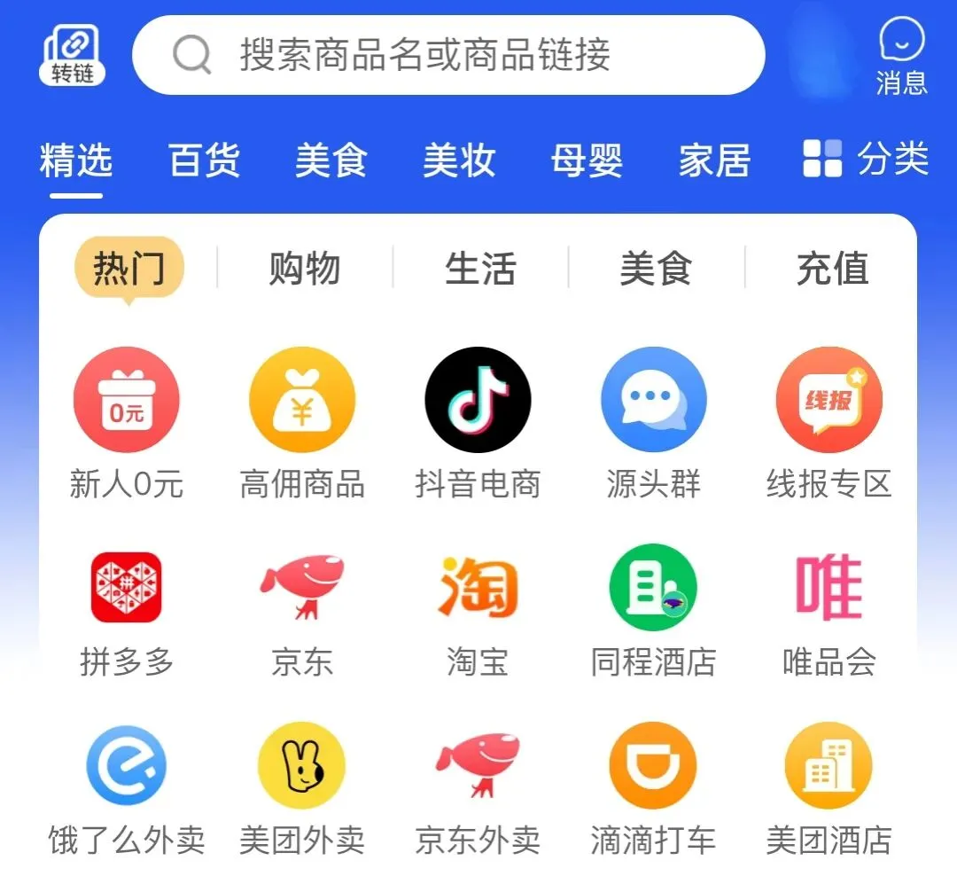 打开APP首页直接列出淘宝、京东、美团等常用平台入口,连分类都省了——复制任何平台的商品链接,打开APP会自动识别,弹出“领券+转链接”的按钮。