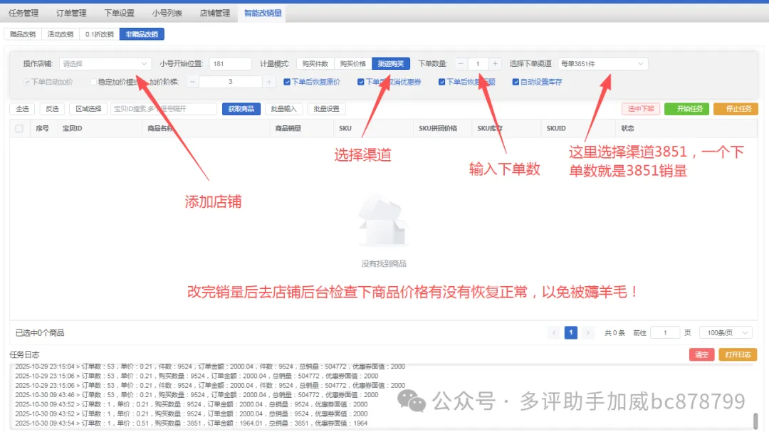 注意事项:订单设置里填写6位数支付密码,需要回到订单里去选择订单付款,先选择一个输入手机号验证自动支付,然后软件会自动跳转自动支付完剩下的订单。出评神器助手赠品改销量下单图文教程: