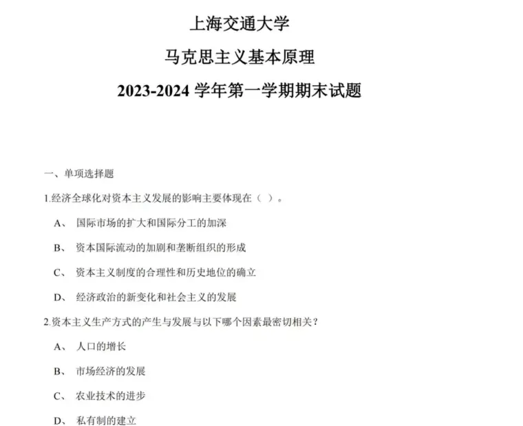 本文最后更新于2026-03-10,某些文章具有时效性,若有错误或已失效,请在下方留言或联系老夜。 上海交通大学马克思主义基本原理期末试题,可打印 获取更多考研资料可加小编QQ:3542263029或者v信kyzlfx 先点“赞+在看”联系客服即可免费赠送公共课(政治英语数学)资料 其他院校陆续更新中…….有需要联系客服留言即可 更多真题资料会第一时间为大家推送 还有其他年份,可联系客服详询 01 部分截图如下🔥 温馨服务 免责申明:资料整理于网络如有侵权请告知删除 长按并识别下方二维码关注公众号,不定时发放考研福利哦 扫一扫添加微信好友,获取更多考研信息哦~