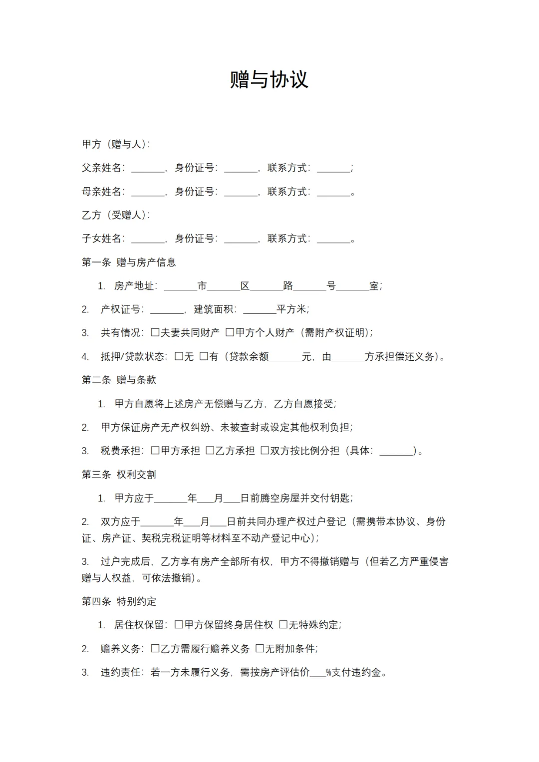 房产赠与子女合同范本,WORD文档电子版,可免费下载打印