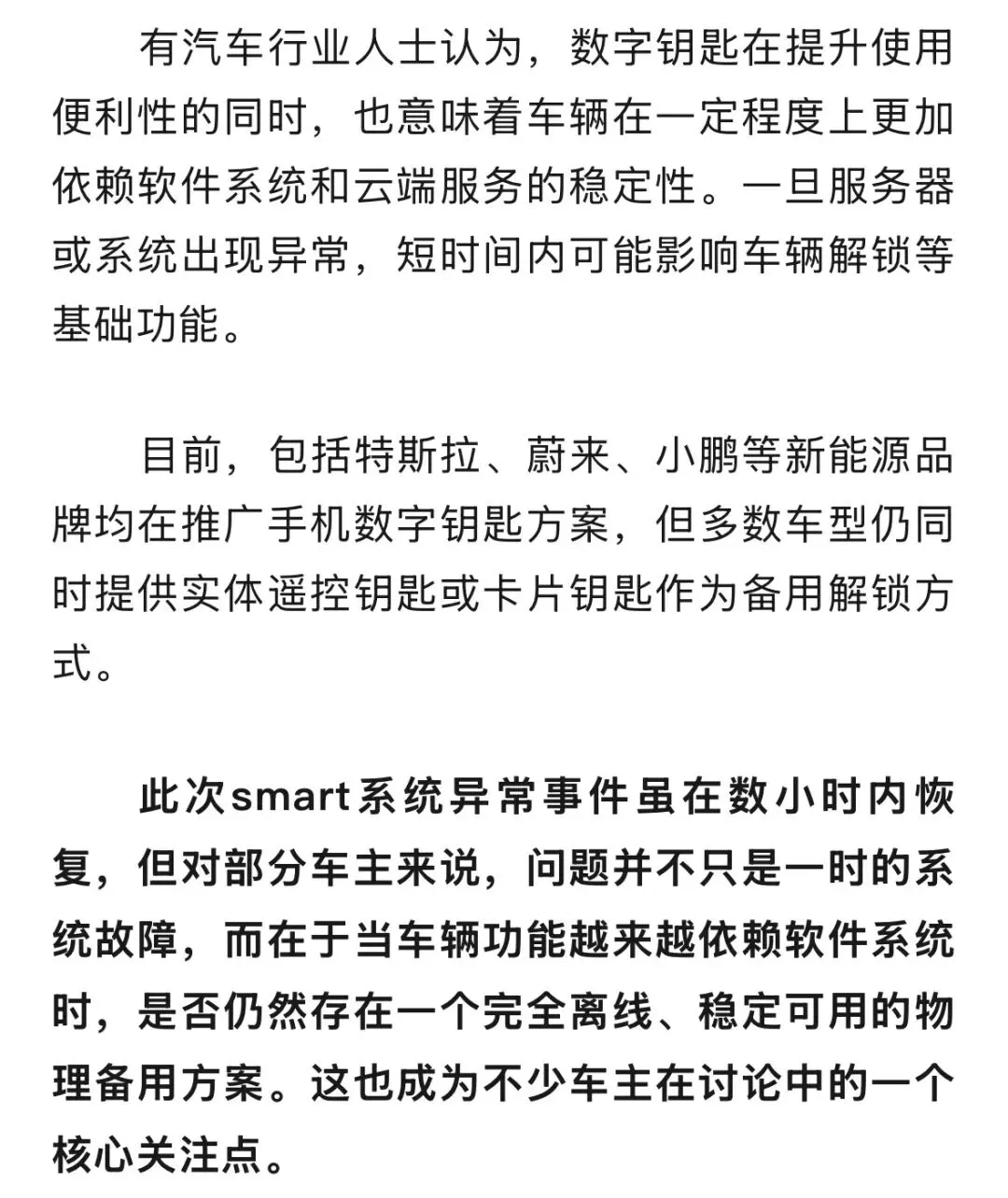 本文最后更新于2026-03-10,某些文章具有时效性,若有错误或已失效,请在下方留言或联系老夜。 奔驰smart纯电SUV官方App故障,蓝牙钥匙失效引车主质疑 来源:新黄河客户端 3月9日,多地smart精灵#5车主反映,官方App出现异常,车辆蓝牙钥匙及远程控车功能一度无法使用。由于部分车型未标配实体遥控钥匙,一些主要依赖手机解锁的车主在故障期间遭遇“有车无法用”的情况,车辆基础使用高度依赖App的设计也因此引发车主质疑。 App异常一度提示“车辆已收回”,部分车主短时间内无法用车 多名车主表示,故障从当天早间开始出现。登录smart官方App时,页面弹出“温馨提示:车辆已收回或无法使用”的提示,并伴随“8006”或“8060”等错误代码。由于提示文案较为敏感,一些车主最初误以为车辆被远程锁定,或账号出现异常。故障时间从9日早晨7点左右,持续至下午。 3.15国际消费者权益日即将到来 各领域、全流程的消费问题 欢迎扫码爆料 编辑:慧敏 一审:连毅 二审:谢蕍 三审:王卫刚 点个“看一看”吧