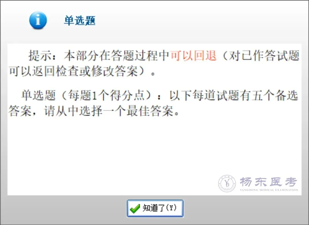 点击「开始考试」后,系统提示在本部分答题过程中可以回退、检查或修改答案。
