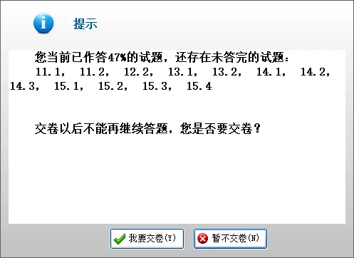 点「交卷」时,如果还有题目未做,会提示以下页面,可继续答题;交卷后并不会立即显示成绩,一般于考后2个月左右公布。