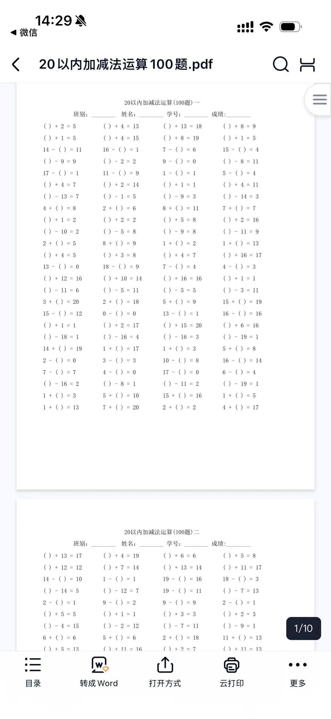 【小学数学】20以内加减法运算(可打印)