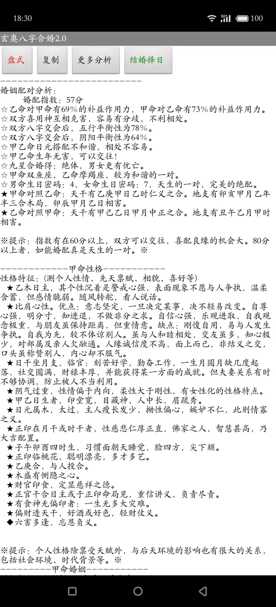 ☆乙命对甲命有69%的补益作用力,甲命对乙命有73%的补益作用力。