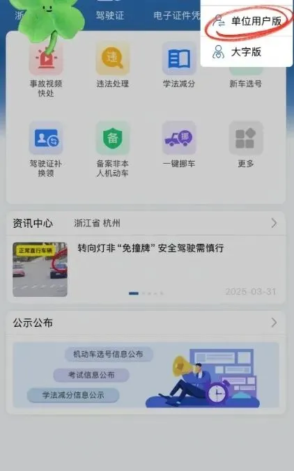 第二步:账户注册成功后,请先登录“交管12123”App个人账号→点击首页右上角的【单位用户版】→选择具体单位后进入单位用户版,即可查看机动车信息或办理相关业务。