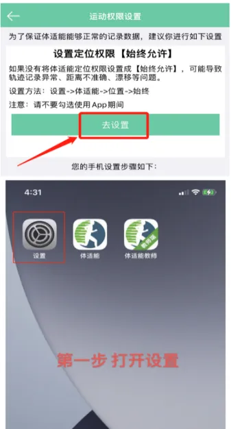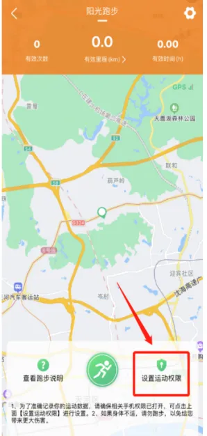 在“首页”,打开“阳光跑步”界面,点击 “设置运动权限,在运动权限设置界面,有手机设置步骤,按照要求进行设置