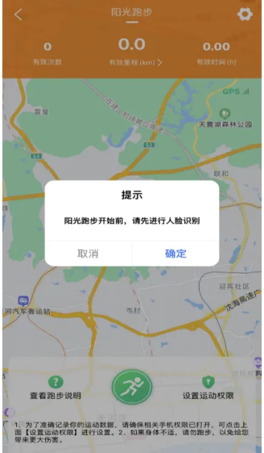 5.4跑步期间请不要退出软件并留意系统提示,跑步途中将随机要求进行一次人脸识别。