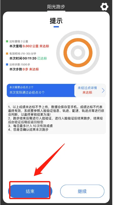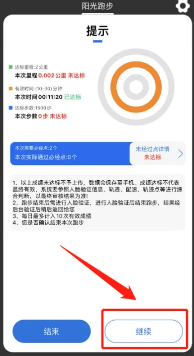 如果发现还有显示未达标的提示,点击“继续”,按照所提示的要求继续跑步。