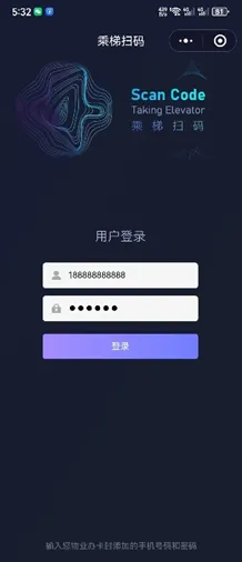 2.打开手机微信,下拉菜单搜索微信小程序“乘梯扫码”苹果和安卓手机都可以使用。录入发卡时候的登记手机号码,默认密码123456点击授权登录就可以了。