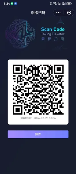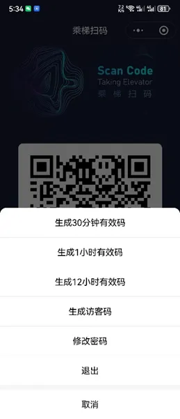 4.有访客来访,用微信或支付宝扫一扫,扫描电梯里边张贴的访客码图片,或者刷卡区上面印刷的二维码。联系业主取得访客码。填写访客码后生成一个20分钟有效的二维码。来访人员直接使用生成的二维码扫描,即可乘坐电梯。无需添加好友即可获取乘梯二维码。