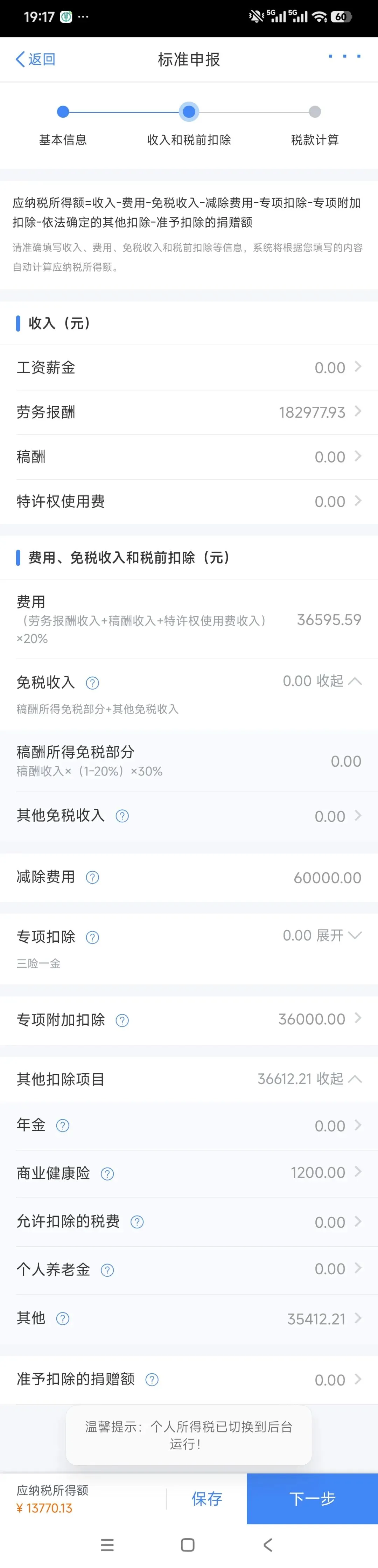 进入税款计算界面核对收入、扣除项目等信息无误后,点击“下一步”进入税款计算界面。系统自动计算应纳税额、已缴税额、应补(退)税额。
