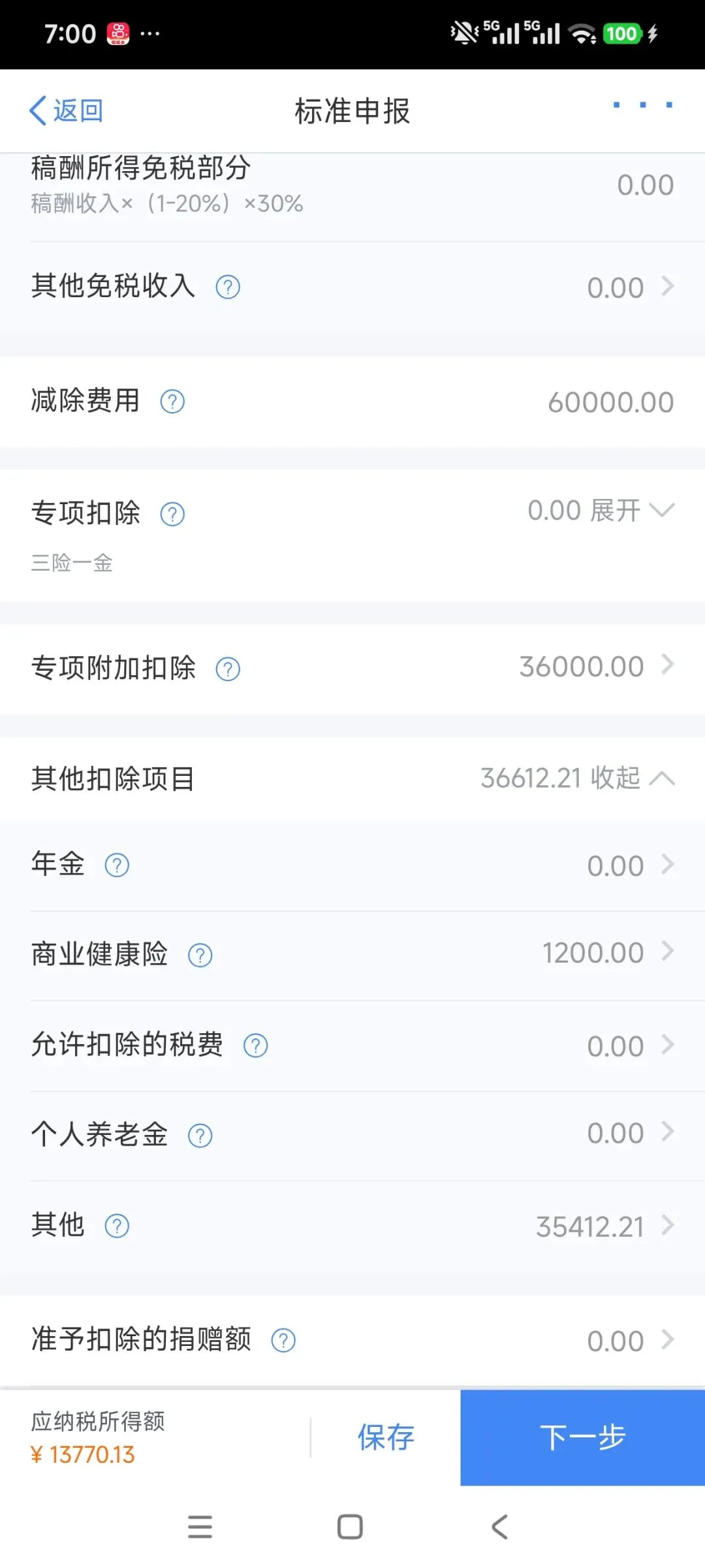 确认税前扣除项目,包括专项扣除(三险一金)、专项附加扣除(子女教育、住房贷款利息等)、其他扣除(年金、商业健康险等)。若专项附加扣除信息不完整,需提前在“专项附加扣除”模块填写。