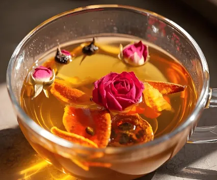 玫瑰3g、陈皮3g、茯苓5g泡水。