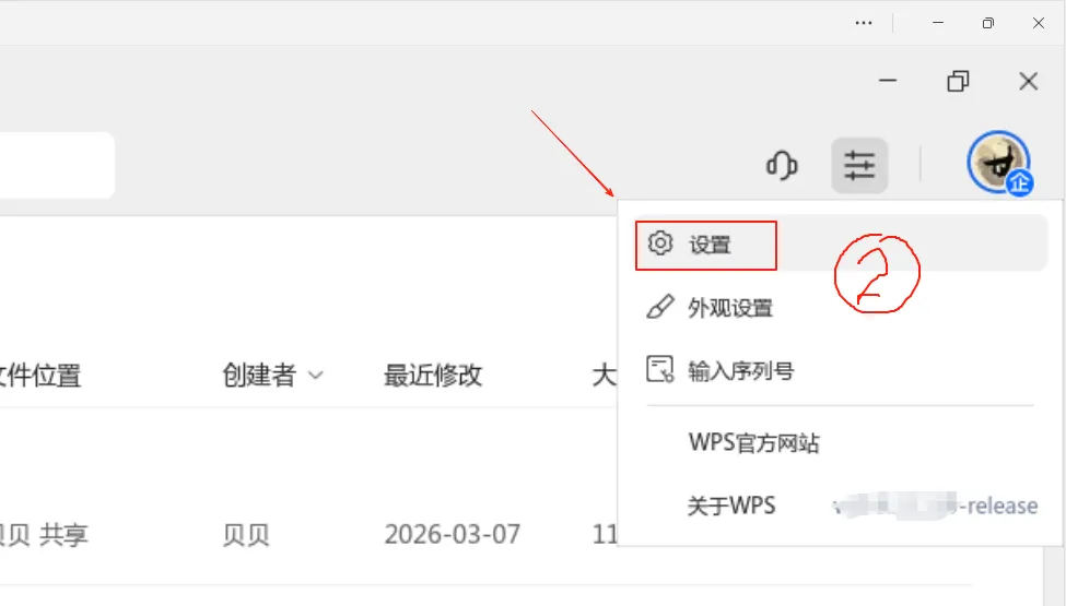 在下拉菜单中,选择最下方的 “设置” 选项,点击进入WPS的配置中心。