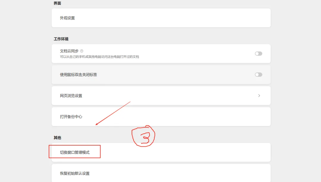 在设置窗口中,找到 “切换窗口管理模式” 这一项,点击它。