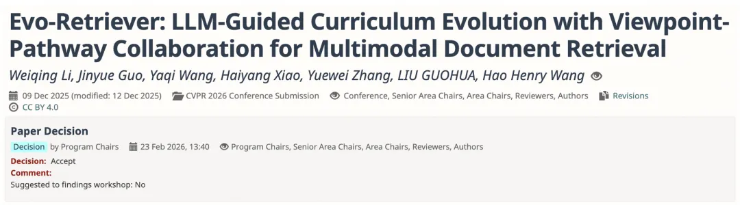 近日,阿里云专有云团队的《Evo-Retriever: LLM-Guided Curriculum Evolution with Viewpoint-Pathway Collaboration for Multimodal Document Retrieval》论文成功入选计算机视觉领域顶级会议CVPR 2026主会。该论文首创“模型-课程协同进化”范式,通过LLM元控制器动态调整训练难度,解决静态训练限制。