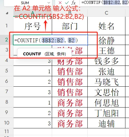 同一部门自动按 1、2、3… 递增序号