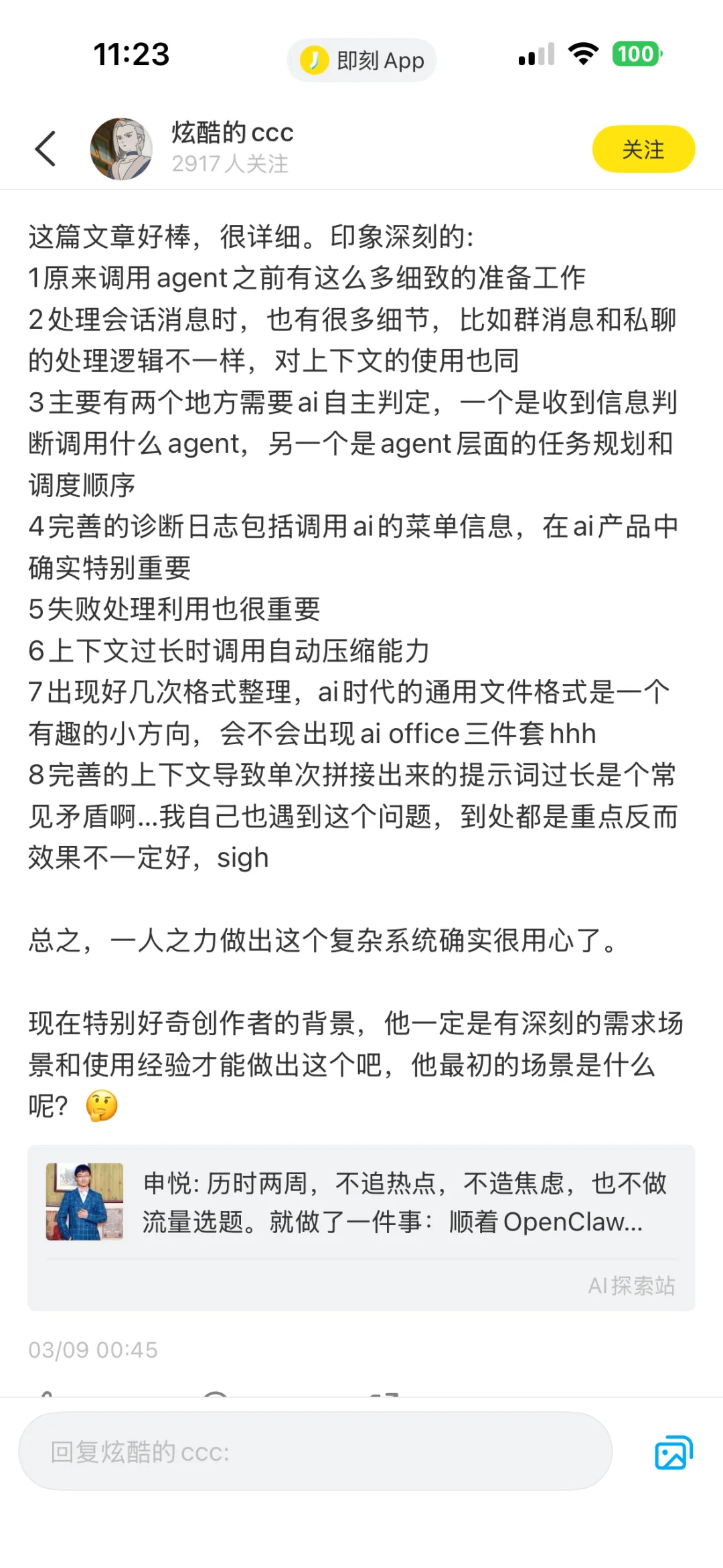 举个极端的例子,你跟他说“今天天气真好”,他可能会先分析你的潜台词,是要围绕天气来产生后续行为,然后他会主动找有没有天气Skill能查天气,如果没有可能会自己写一个,然后再基于天气规划你今天的日程等等。但其实你可能只需要一句“看起来你心情不错”的回复……