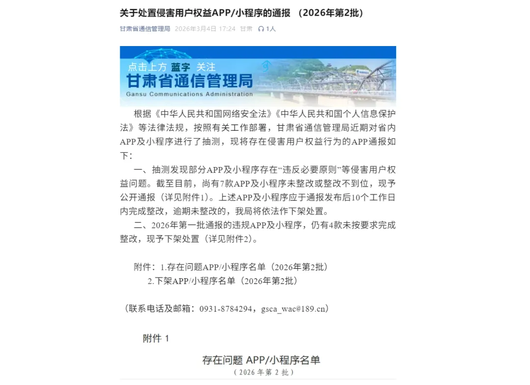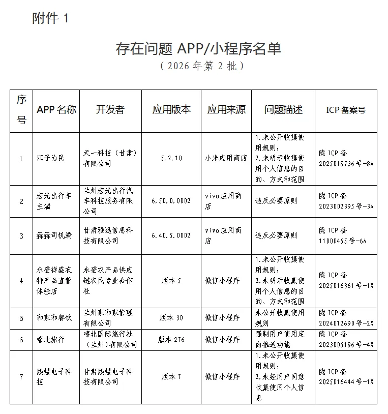 甘肃省通信管理局关于处置侵害用户权益APP/小程序的通报 (2026年第2批)