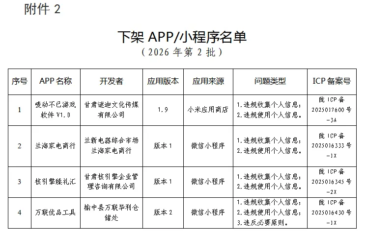 二、2026年第一批通报的违规APP及小程序,仍有4款未按要求完成整改,现予下架处置(详见附件2)。