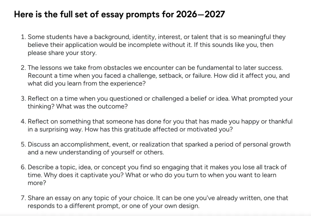 就在刚刚,Common App正式敲定了2026-2027申请季的主文书题目。