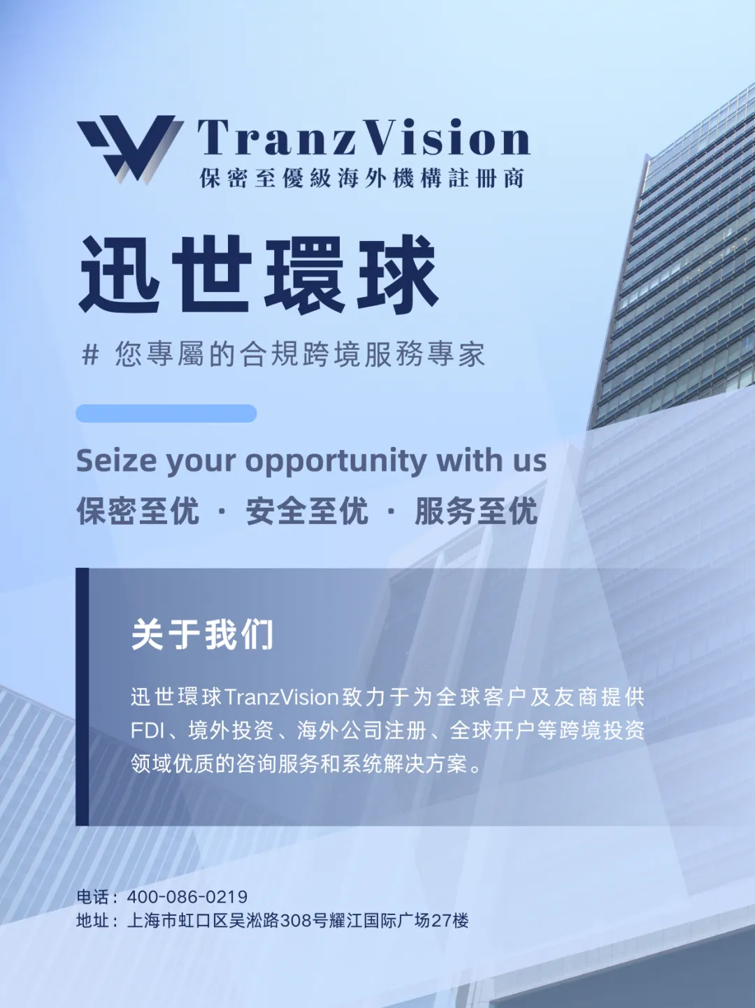 TranzVision 是企业布局海外、全球化运作的绝佳合作伙伴。服务领域涵盖36个主权国家及离岸金融中心,专注于全球公司注册、跨境投资、海外财税、海外置业,投资移民等一站式专业跨境服务。