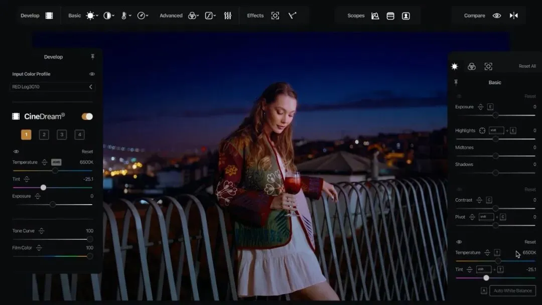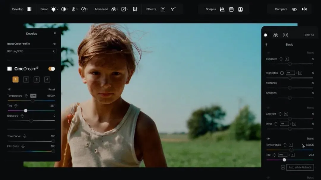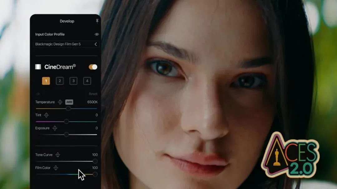 CineDream为你的画面呈现自然、一致的电影色彩——无需LUT猜测、浑浊的肤色或无休止的调整。它基于类似好莱坞流程的ACES色彩科学,为素材建立标准化的电影级色彩基础,并提供“点击画面直接调色(Click and Grade)”、胶片风格模拟、皮肤色与曝光辅助、批量匹配镜头等工具,让用户无需复杂的调色知识也能快速获得自然统一的电影感效果,同时仍可通过曲线、色轮和强度控制进行精细调整。支持LOG与普通素材。