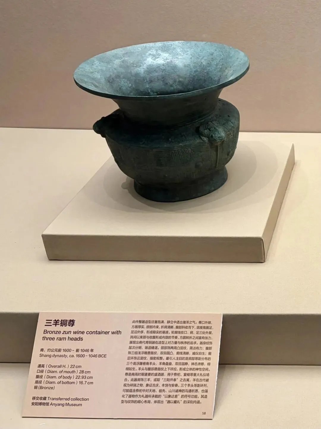 比如三羊铜尊,外观有三只羊。然后旁边的展品说明提到:……此器肩饰三羊,或取“三阳开泰”之吉寓……