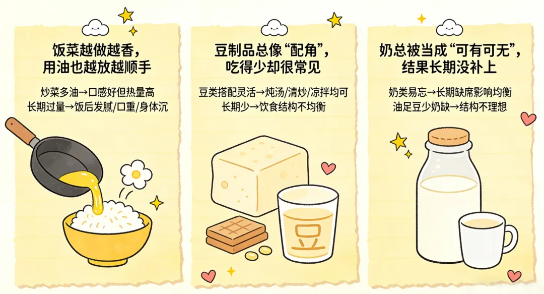很多人都以为,只要一日三餐正常、荤素都有,就算吃得不错了。其实未必如此。现在很多家庭,最常见的不是吃不够,而是油偏多、豆偏少、奶偏少。